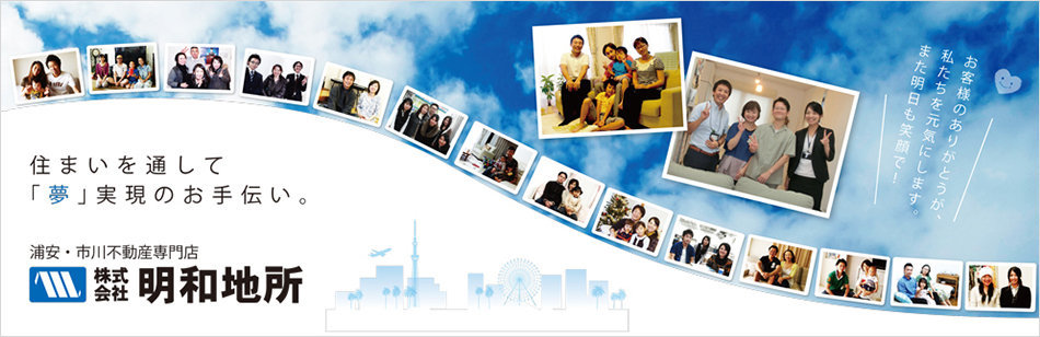 明和地所は浦安の発展とともに歩みつづけております弊社は、浦安市誕生前の昭和54年に創業。私は不動産業を営みながら、浦安いう街の発展をじかに体感してきました。 浦安市は、その面積の約4分の3が埋め立てであるという特殊な地域ですが、浦安市の現状を見てみますと、日本全国の中で、3,500万人が住む首都圏にあって、都心部から12kmの浦安市は色々な条件を満たしており、検証すればするほど、「天の時、地の利、人の和」を感じます。弊社はこれからもこの浦安市を活動の拠点とし、「浦安の不動産 のことなら明和地所」 と呼ばれる不動産業者として、お客様により良いサービスを提供しつづけたいと思います。人々の喜びを感じながら仕事ができる幸せは、人間である我々のもちうる最高の幸せです。人が生まれて、入学して、卒業して、就職して、結婚して、子供を生み育て、退職し、やがて死ぬまでの人生の折り目折り目に、弊社は「 お客様がより自分らしく生きるための諸問題の解決に、頼りにされ、信頼され、一生涯にわたり利用して頂ける企業でありたい!」 と思います。
