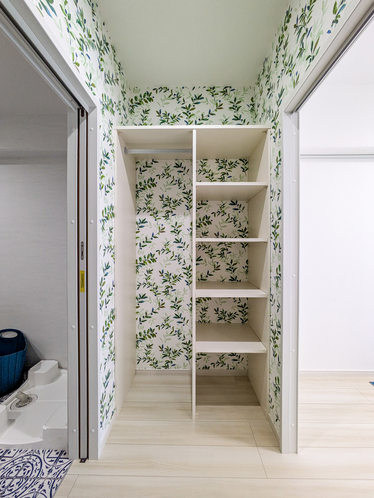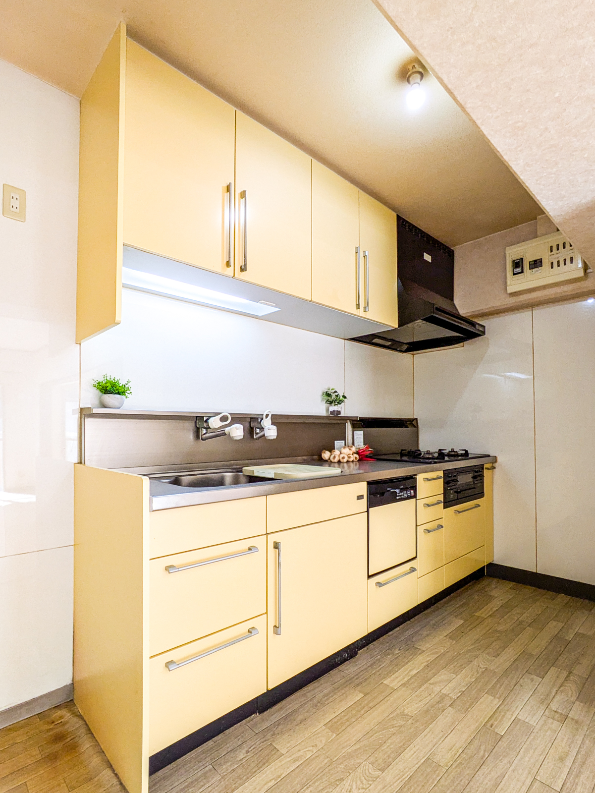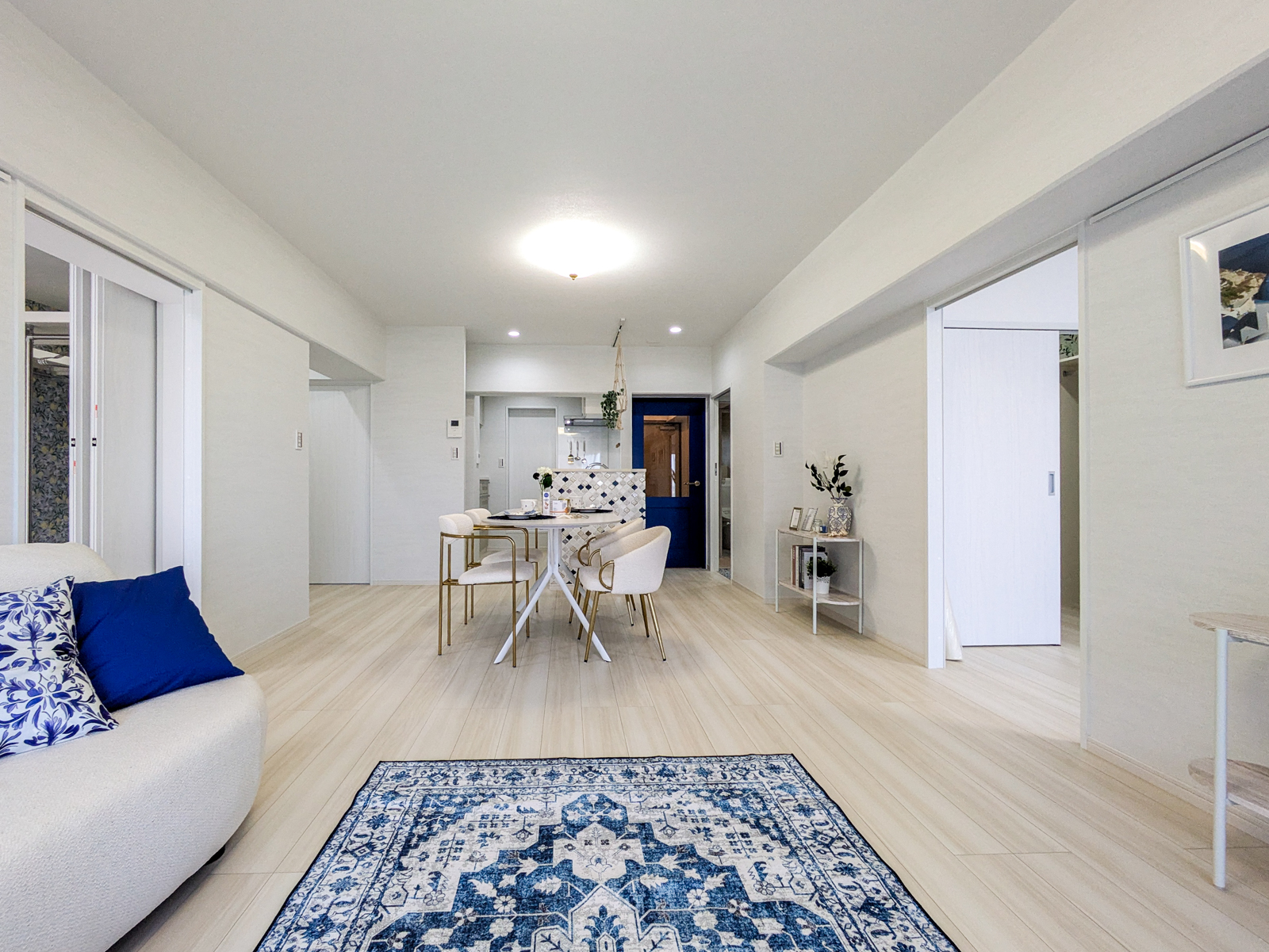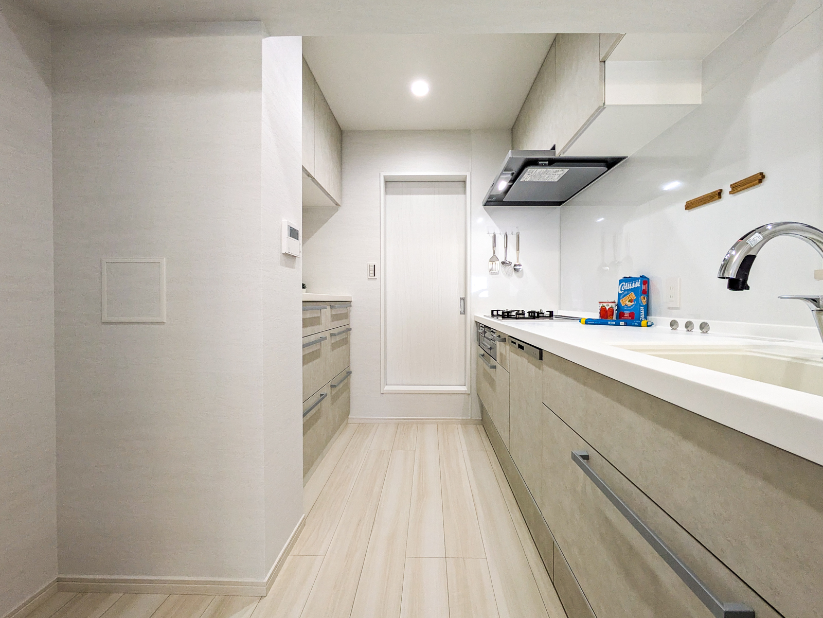 【リノベーション内容】断熱施工(外部に面した壁面)。システムキッチン(Ⅱ型・食洗機)・ユニットバス(1116・浴室暖房換気乾燥機)・洗面化粧台・トイレ・給湯器(追焚・外出し施工)交換。専有部配管更新。フローリング・クロス・建具など内装工事。収納造作。ハウスクリーニング等。