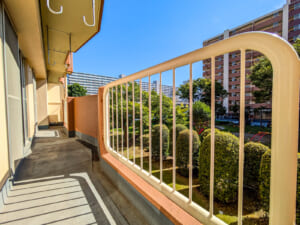 陽光が降り注ぐ明るいバルコニー。緑豊かな景色を楽しめます。