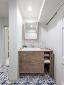 三面鏡収納付き洗面化粧台で、洗面台まわりをいつもきれいに保てます。