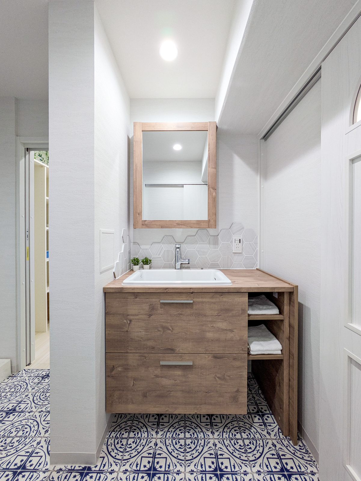 三面鏡収納付き洗面化粧台(LIXIL)。三面鏡と豊富な収納で、使い勝手も良好。