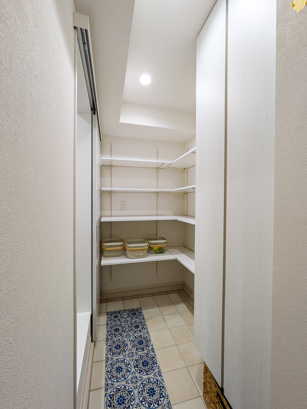 キッチンの隣に収納棚を造作。小物もすっきり片付く便利な空間。