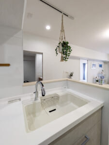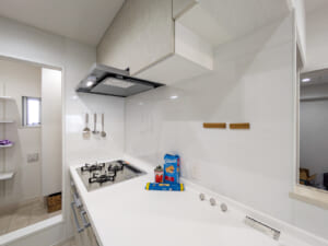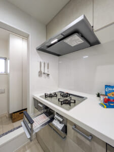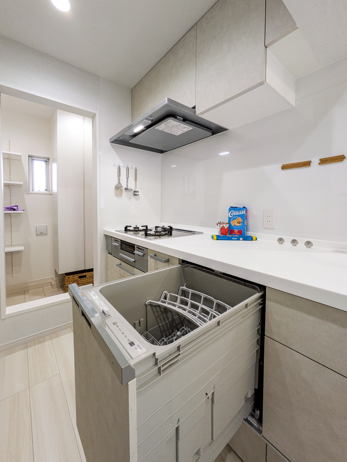システムキッチンは自動水栓と食洗機付きで、家事を効率化。浴室には浴室暖房換気乾燥機を設置し、雨の日のお洗濯にも対応できます。
