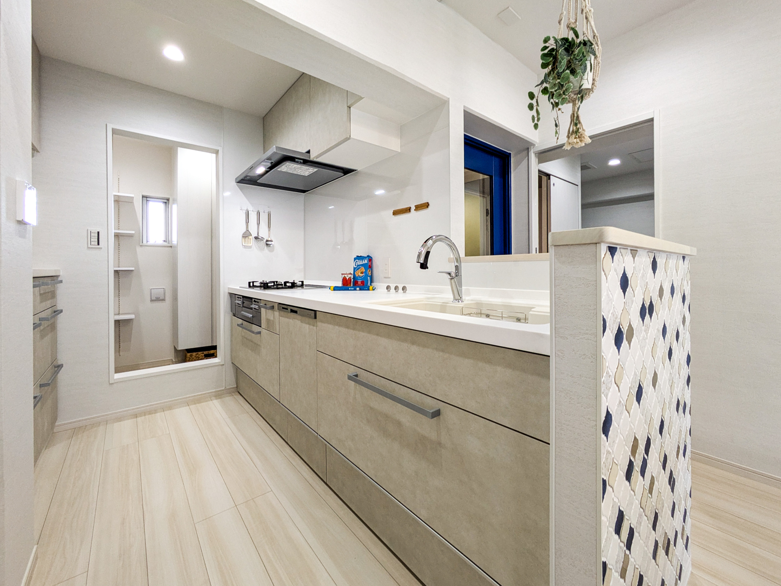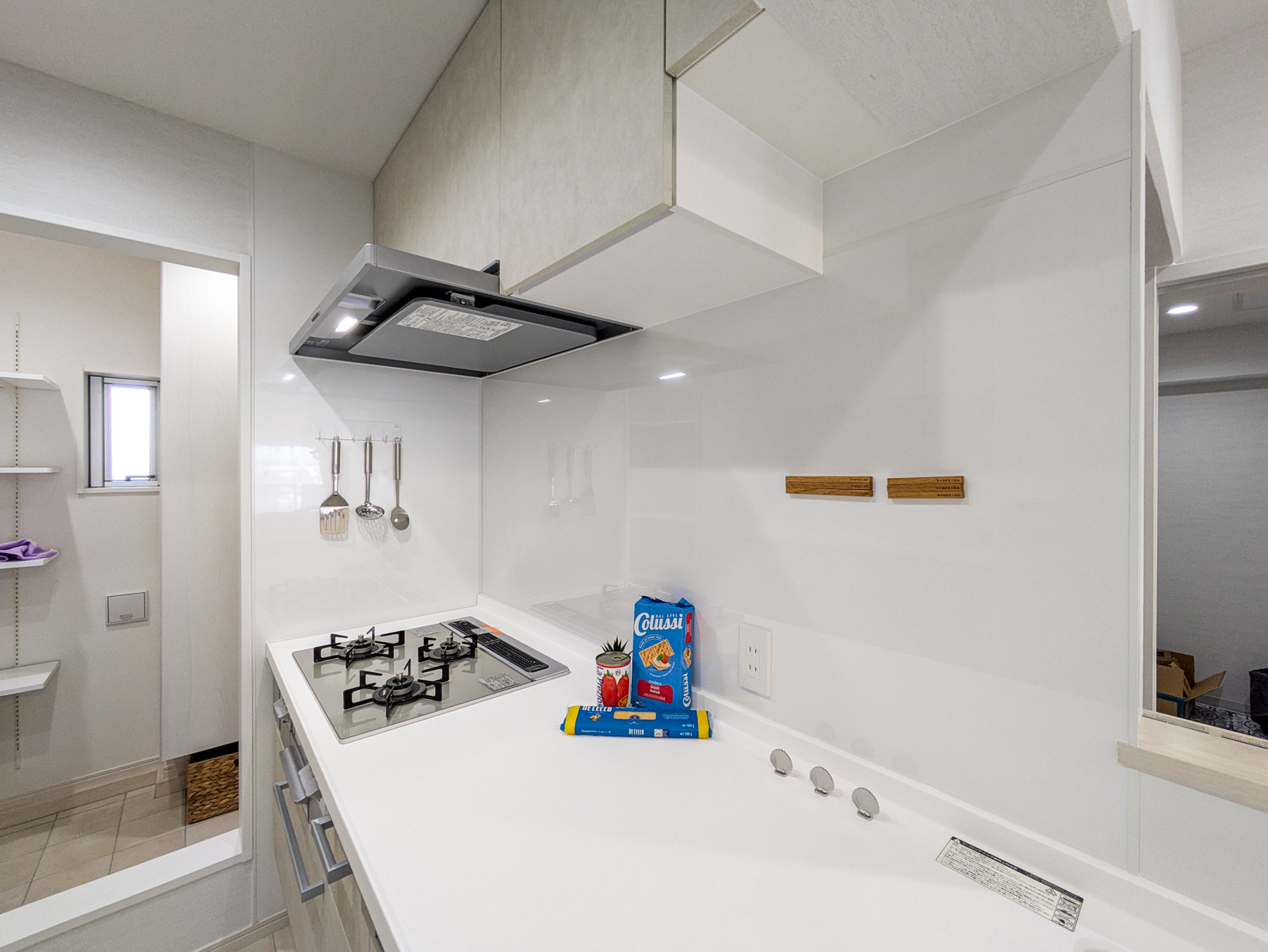 1階キッチン。専用庭に出られる勝手口があります。廊下、リビングの2方向に出られる家事動線に優れた2WAYキッチン。