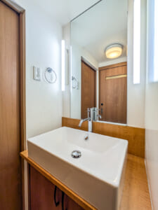 デザイン性に優れた洗面ボウルを採用した、スタイリッシュな洗面空間。大きな鏡が奥行きと明るさを演出します。