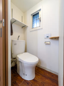 自然換気が可能な窓付きのトイレ。温水洗浄便座や上部棚を設けた、機能的で清潔感のある空間です。