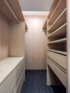 多機能な収納棚を設けたウォークインクローゼット。棚板や引き出しを備えた、整理しやすい設計です。