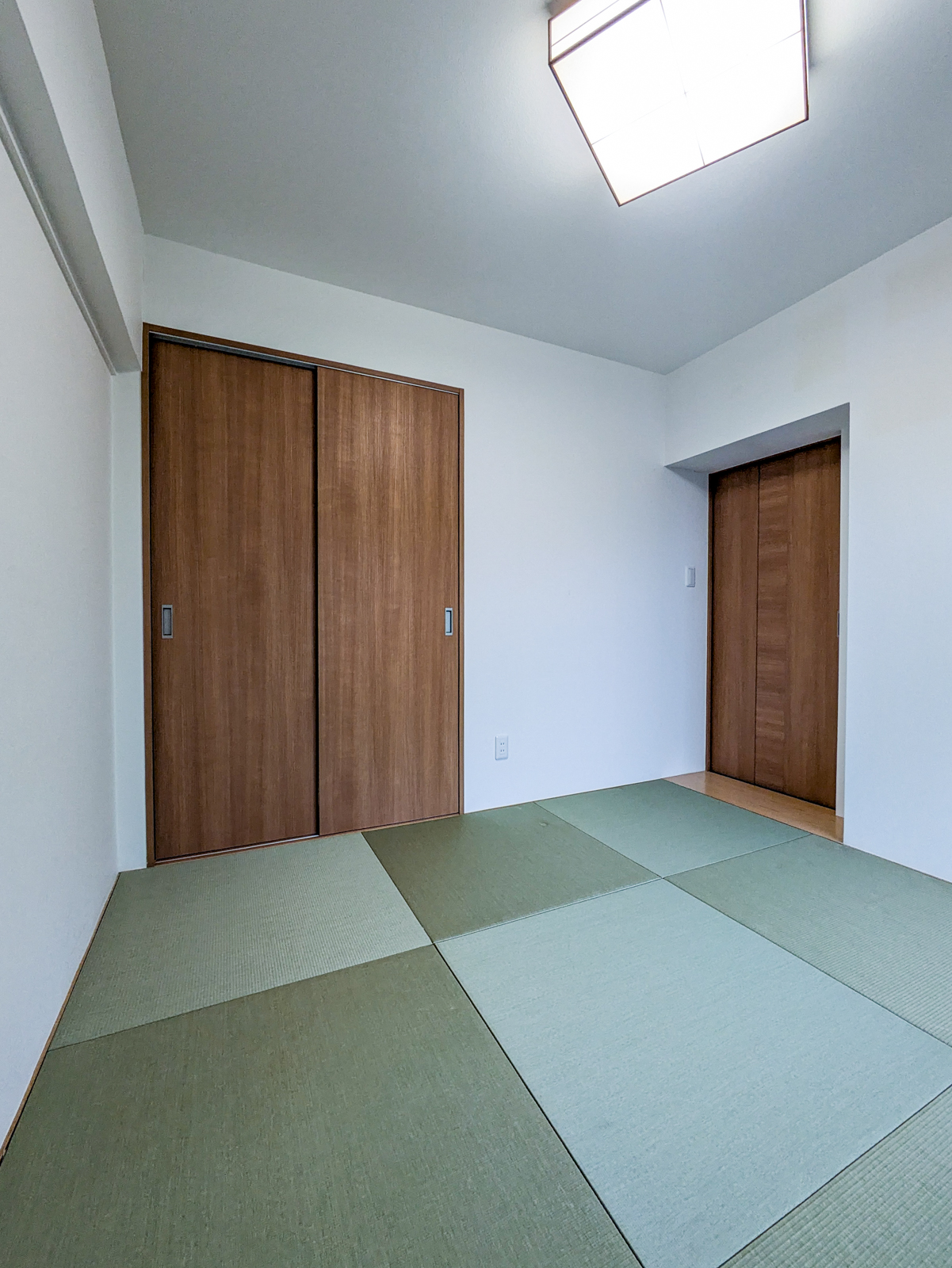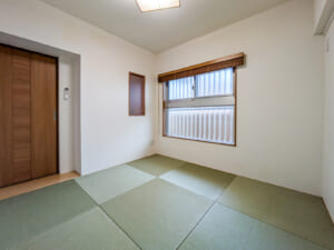 2015年リフォーム済みの和室。フチなし畳が室内をすっきりと見せ、和洋折衷の家具とも馴染む意匠です。