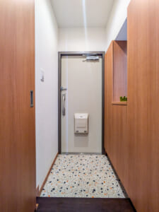 収納力のある玄関収納を配置。人感センサー照明により、暗い時間帯の帰宅時もスムーズな入室が可能です。