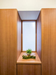 和室からの明かりを玄関に届ける室内窓。小物を飾れるカウンターとしても活用できるお洒落な設計です。