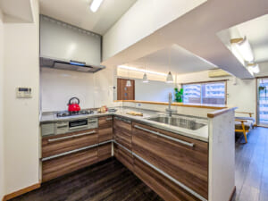 浄水器や食洗機を備えたL型システムキッチン。作業動線に配慮された設計で、日々の調理もスムーズです。