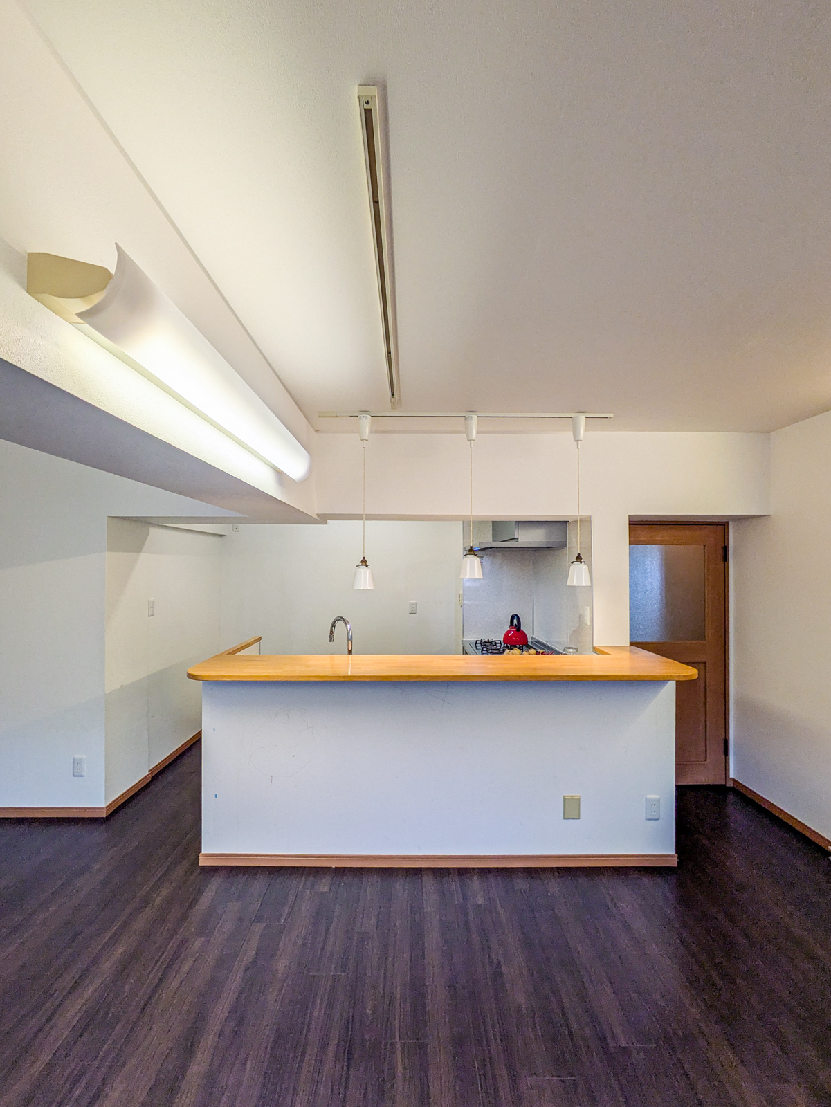 梁を活かした照明が灯るLDK。アーチ状の意匠を施した壁面が、個性的で品のある空間を演出しています。