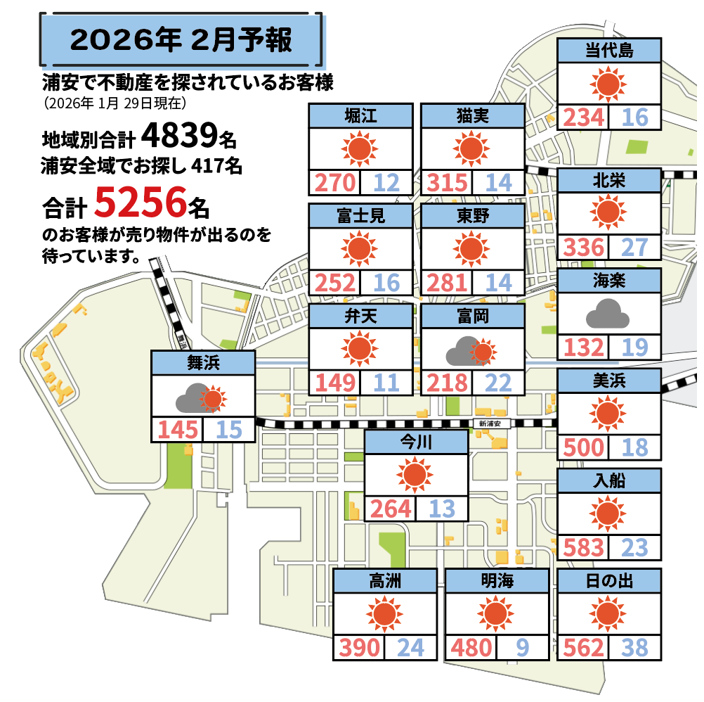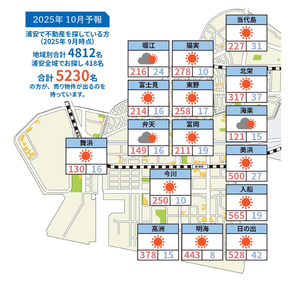 浦安市内の中古マンション・一戸建てなどの販売流通情報を基に、動向を天気図としてわかりやすくまとめた「浦安相場天気予報」