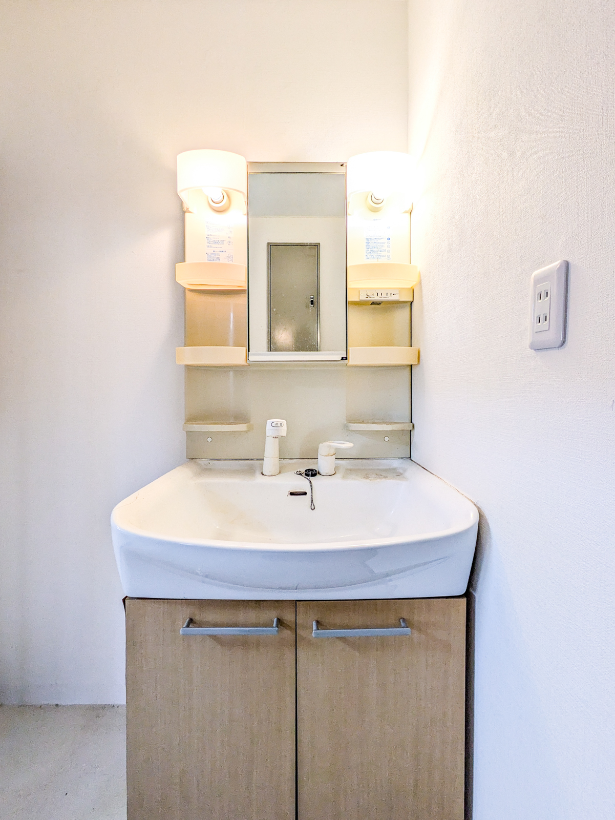 三面鏡収納付き洗面化粧台。収納豊富な洗面化粧台です。