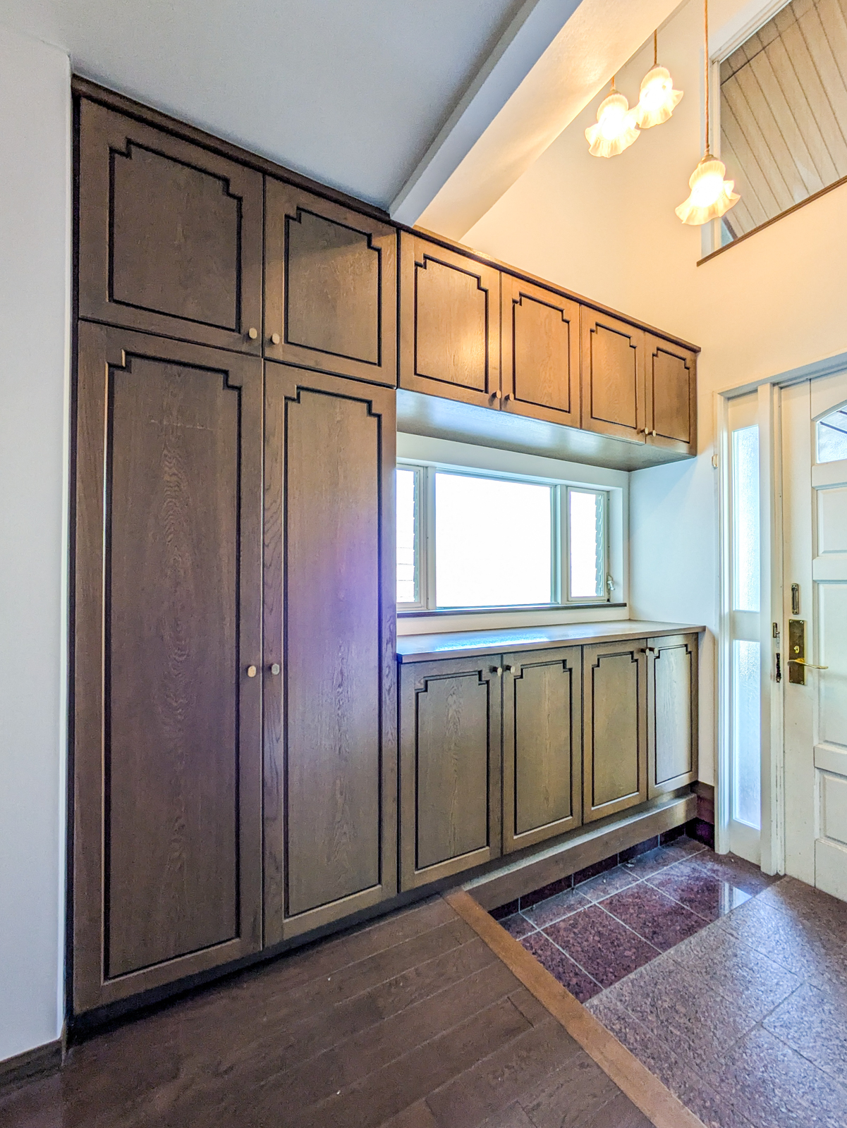 天井までのトール型収納。足元を照らすフットライト付きで、下部スペースも有効に活用いただけます。