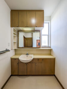 三面鏡裏の収納に加え、サイドに大型のトールキャビネットを備えた洗面化粧台です。木目調のデザインが落ち着きを演出し、小物から日用品のストックまで整理して収容できます。