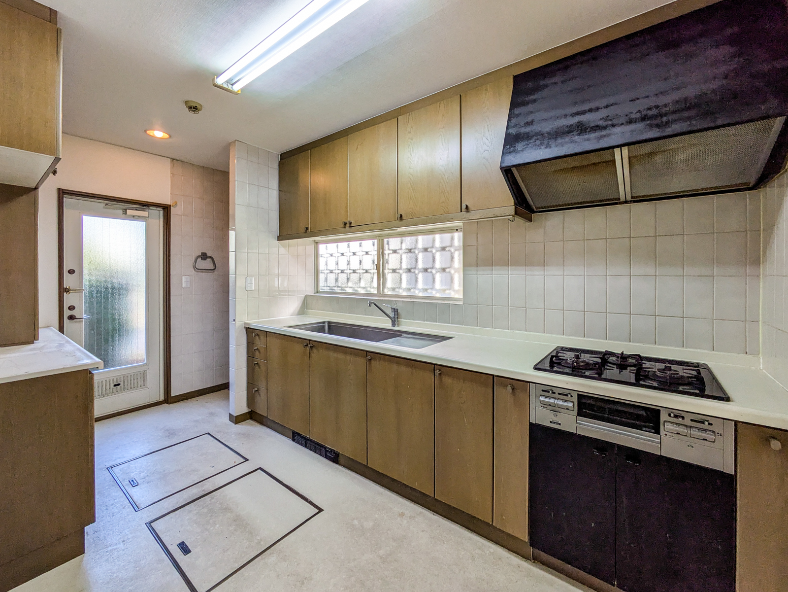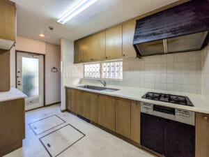 1階キッチン。専用庭に出られる勝手口があります。廊下、リビングの2方向に出られる家事動線に優れた2WAYキッチン。