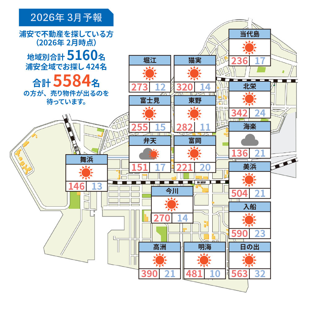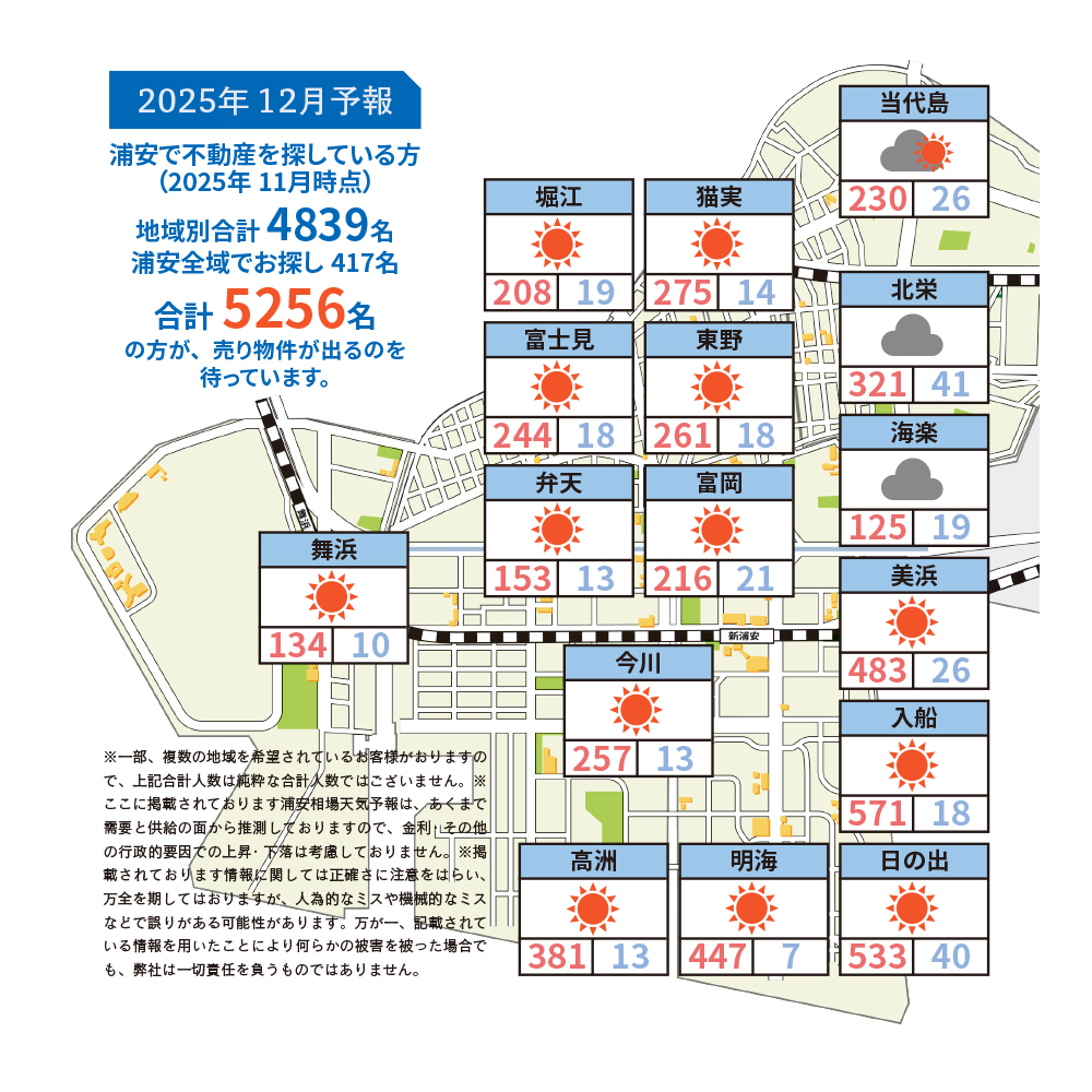浦安市内の中古マンション・一戸建てなどの販売流通情報を基に、動向を天気図としてわかりやすくまとめた「浦安相場天気予報」