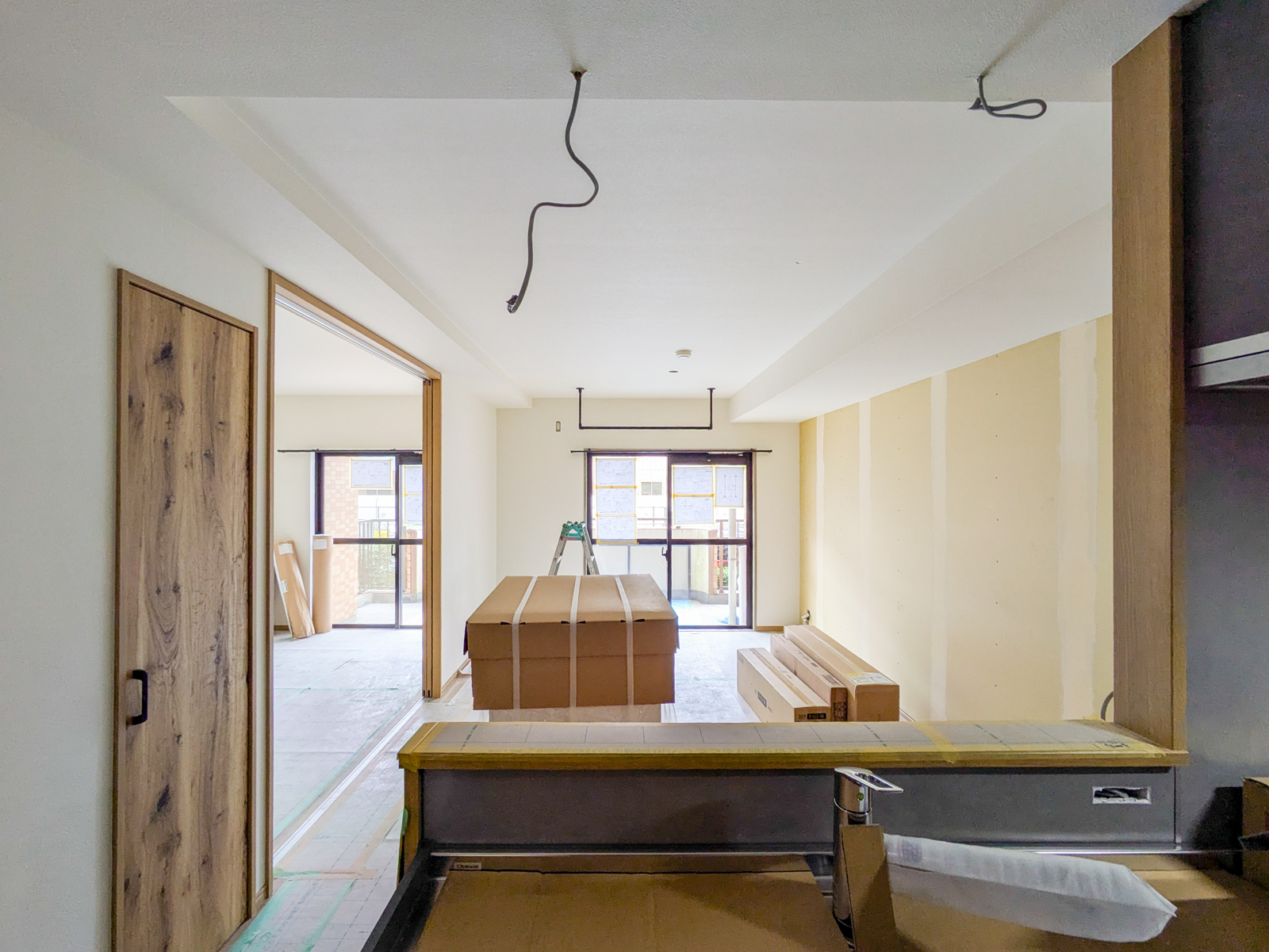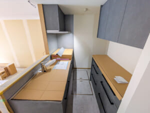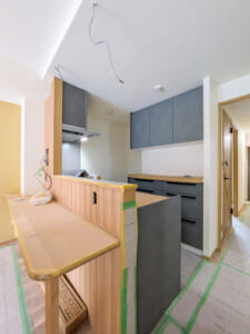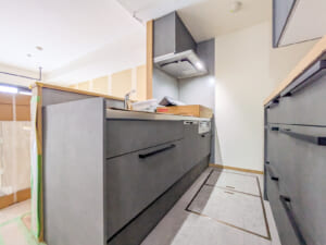リノベーション内容 システムキッチン(クリナップ・ラクエラ)・ユニットバス(TOTO・リモデルバスルーム)・洗面化粧台(タカラスタンダード)・トイレ(TOTO)交換。専有部配管更新。フローリング(LL-40・置き床)・フロアタイル(洗面室・トイレ)・全室クロス貼替。建具交換。収納造作。床下断熱施工等。
