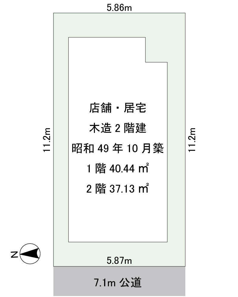 敷地は整形地で、西側約7.1mの公道に約5.8m接道しています。間口もしっかり確保されており、土地としての資産価値も見逃せません。建物は1階を店舗・事務所、2階を居宅として利用可能な4Kタイプです。