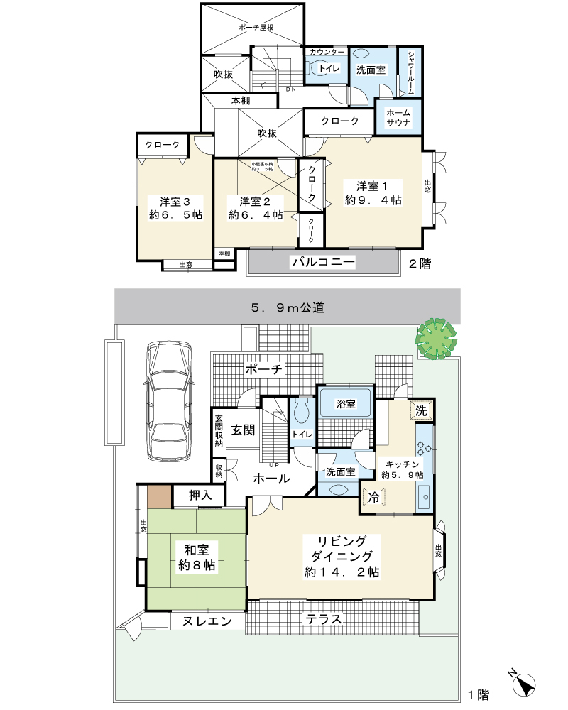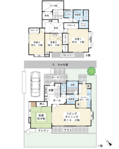 | 間取内容 | LDK 20.1畳 1階 1室 和室 8畳 1階 1室 洋室 9.4畳 2階 1室 洋室 6.4畳 2階 1室 洋室 6.5畳 2階 1室 |