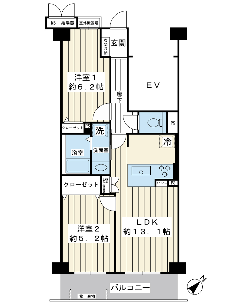 間取りは家族の時間を大切にできる13.1帖のLDKを備えた2LDKプランです。