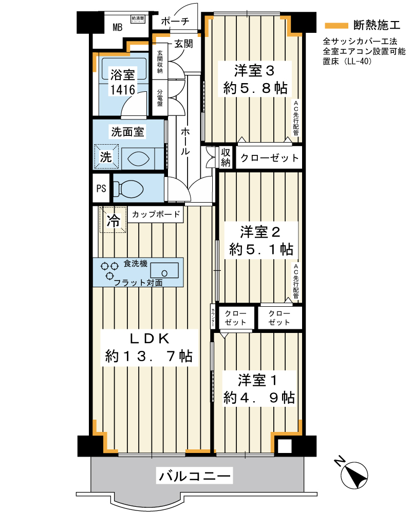 | 間取内容 | LDK 13.7畳 3階 1室 洋室 4.9畳 3階 1室 洋室 5.1畳 3階 1室 洋室 5.8畳 3階 1室 |