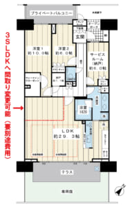 | 間取内容 | LDK 29.3畳 1階 1室 洋室 10.0畳 1階 1室 洋室 6.0畳 1階 1室 S 6.0畳 1階 1室 3SLDKへ間取り変更可能(要別途費用) |