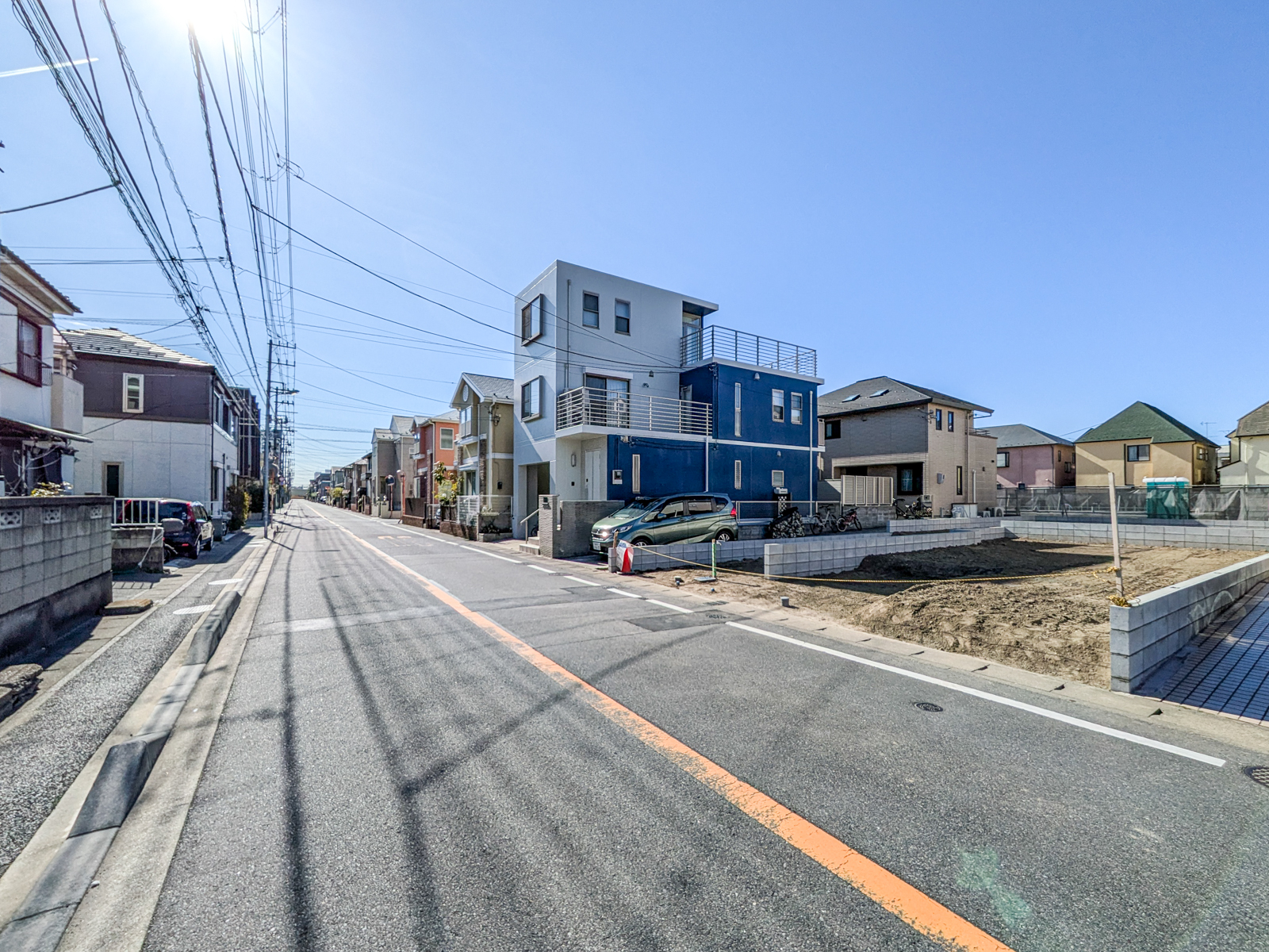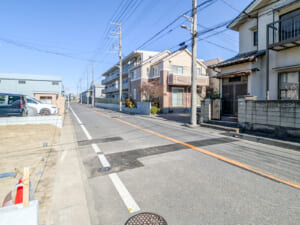 北東側道路は幅員が約7.9mあり、向かいの建物との距離が保たれるため、通風や採光を考慮した設計がしやすい土地です。