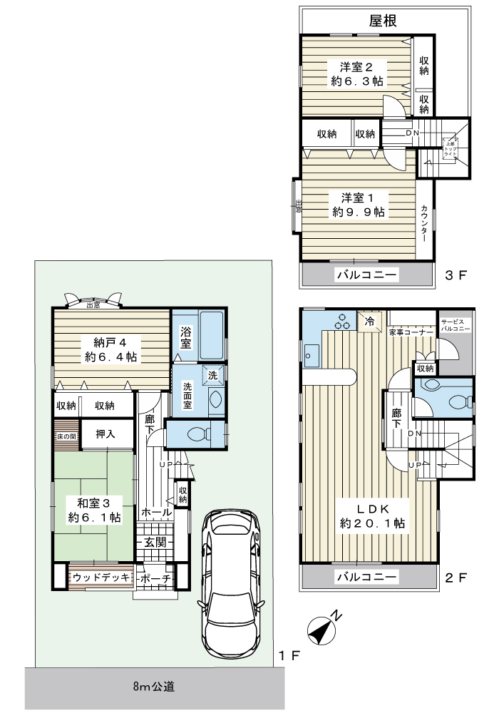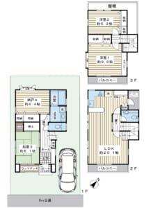 | 間取内容 | 和室 6.1畳 1階 1室 S 6.4畳 1階 1室 LDK 20.1畳 2階 1室 洋室 9.9畳 3階 1室 洋室 6.3畳 3階 1室 |