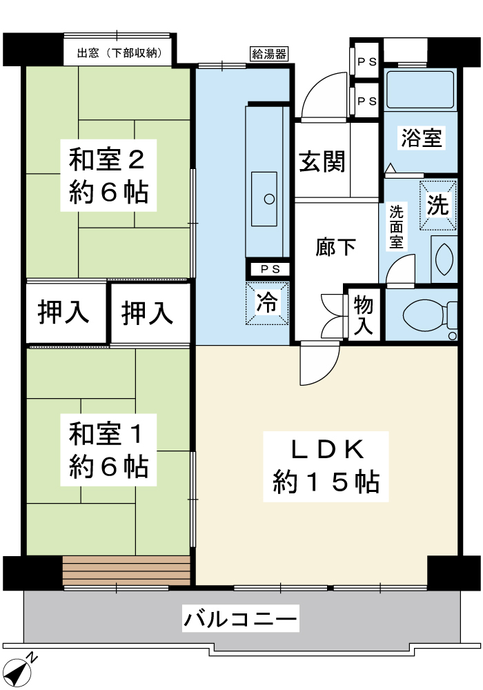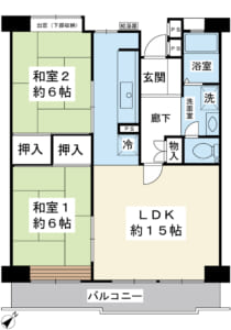 専有面積65.07㎡の2LDKプランです。南東向きのバルコニーに面した約15帖のLDKは、明るく開放感があります。
