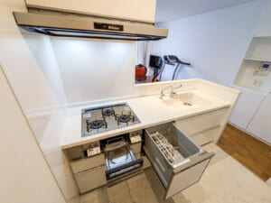 間取りは南東・北西の両面バルコニーにより、1階ながら開放的で風通しの良い住まいです。約14.4帖のLDKには食洗機付きの対面式キッチンを採用し、背面には便利なカップボードを設置済みです。