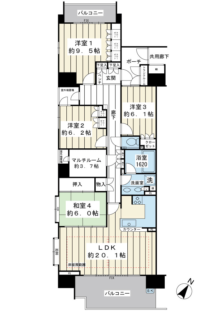 | 間取内容 | LDK 20.1畳 3階 1室 洋室 9.5畳 3階 1室 洋室 6.2畳 3階 1室 洋室 6.1畳 3階 1室 和室 6.0畳 3階 1室 S 3.7畳 3階 1室 |