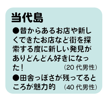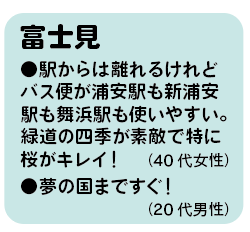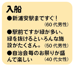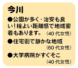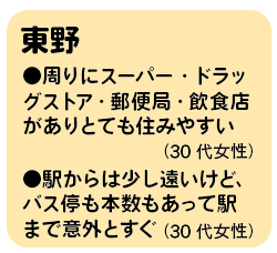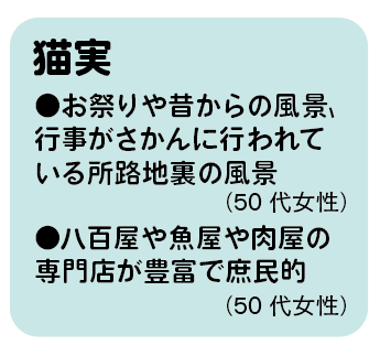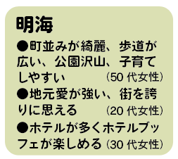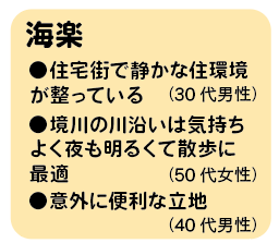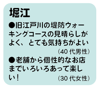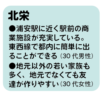 生活者の声:「八百屋や魚屋、肉屋など専門店が豊富」「駅前商業が充実」「東西線で都内に出やすい」。