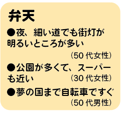 生活者の声:「自転車ですぐ」「徒歩で行ける」「夜も街灯が明るくて安心」「緑が多く施設も充実」。