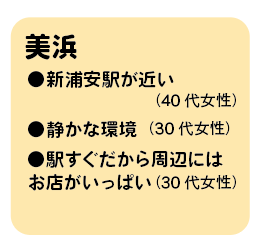 A. 新浦安駅周辺は広い歩道・緑道・公園が多く、大学病院も近い点が支持されています。